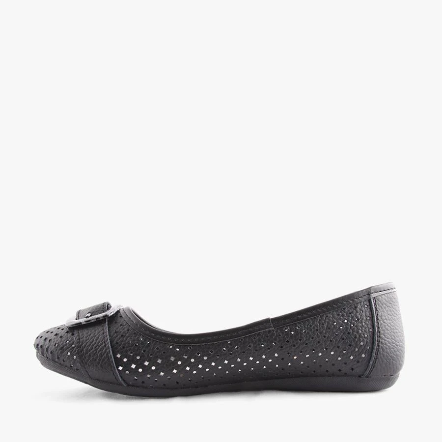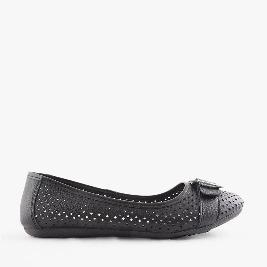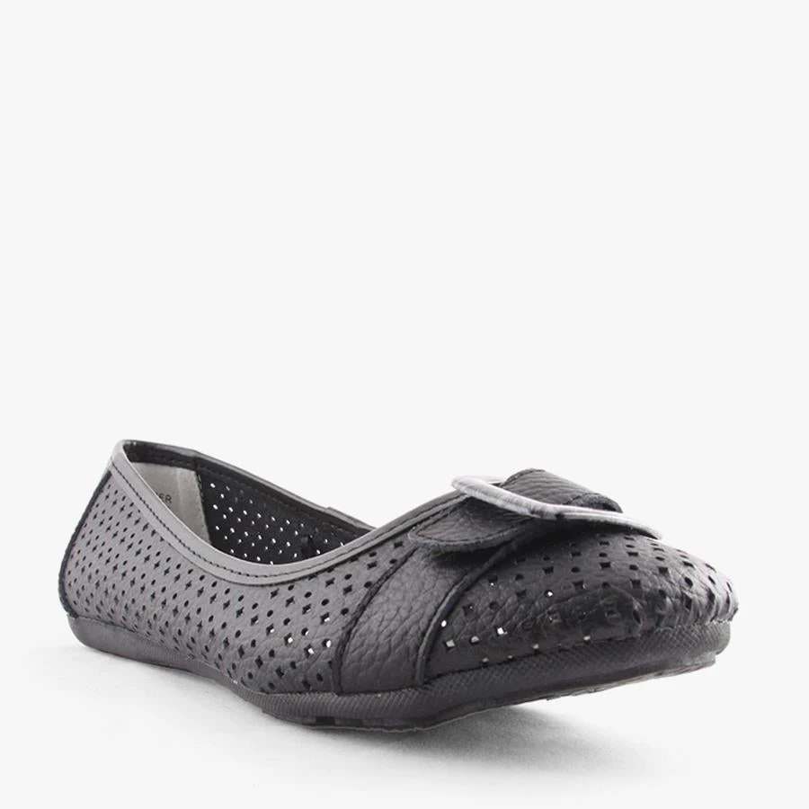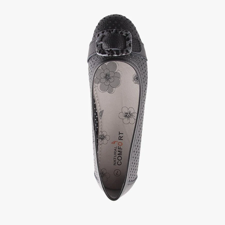 Almond by Natural Comfort is a women’s leather ballet flat that features a laser cut perforated design and a faux animal print buckle across the toe with a flexible outsole.