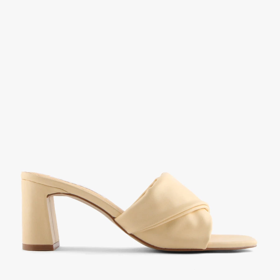 Aniston by Pied A Terre is a backless block heel that features an on trend square toe and a simple wide strap with fold detail.