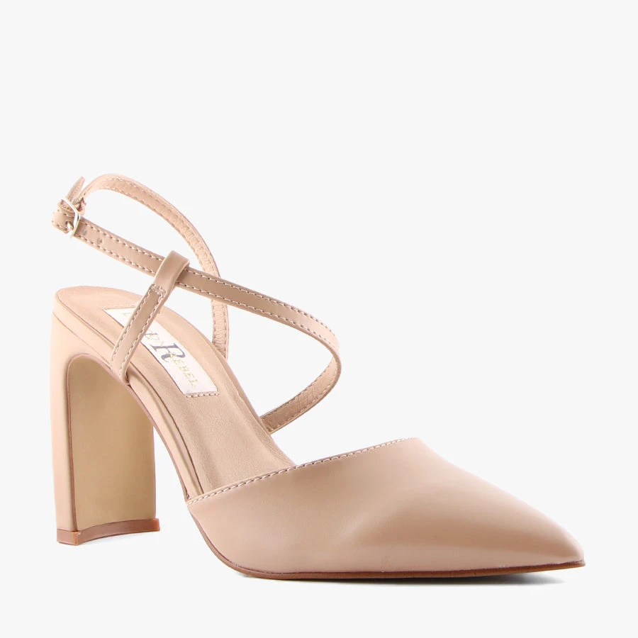 Blake by London Rebel features an on trend curved block heel, strappy upper with buckled closure and a closed pointed toe.