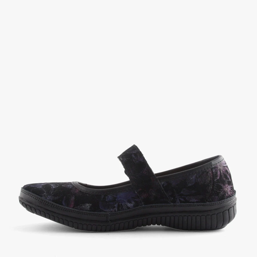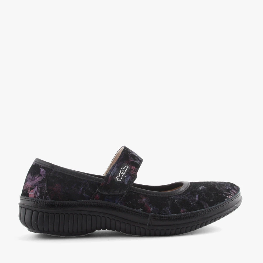 Calista by Just Bee is an ideal casual for everyday wear. The Mary Jane style velcro strap makes it easy to slip on and off, has a leather upper with a subtle floral print.