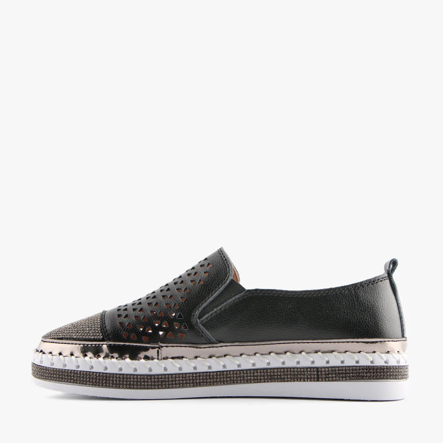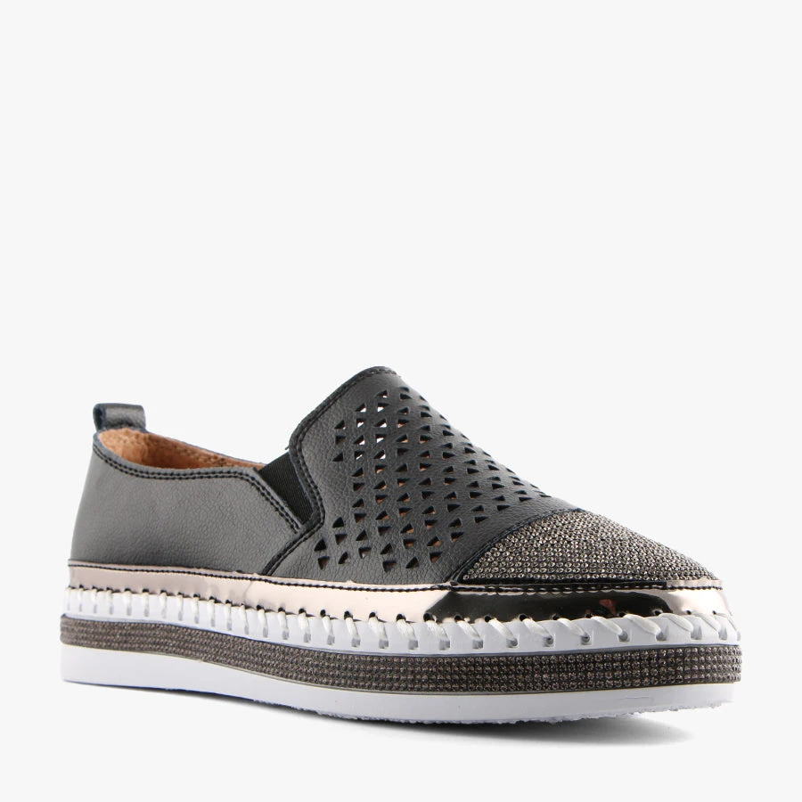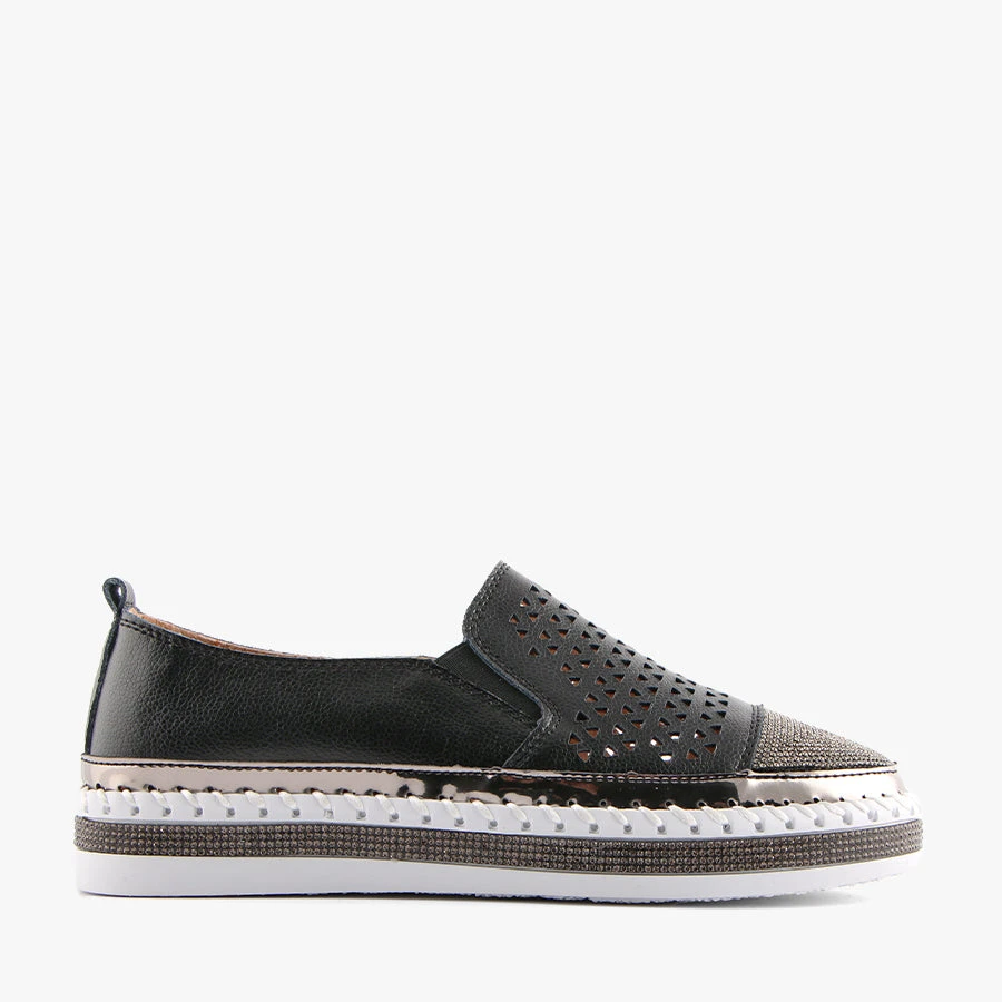 Caly by Just Bee is a women’s flat that features a soft leather upper with a laser cut design, a diamante toe cap and a diamante trim around the sole.
