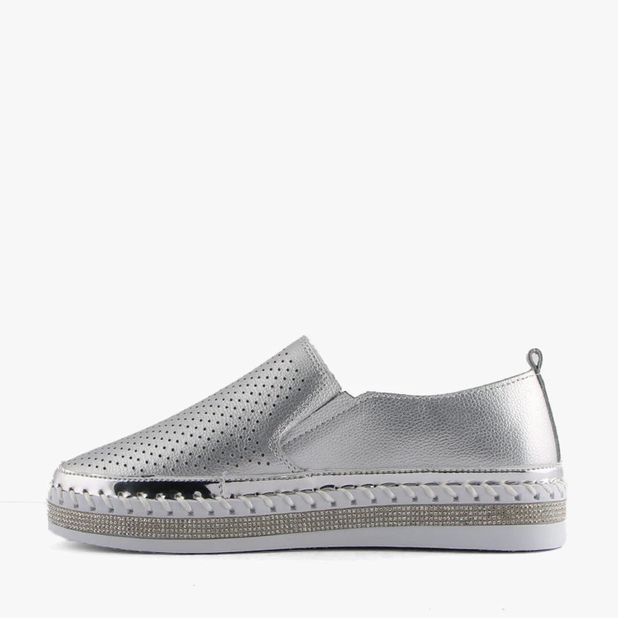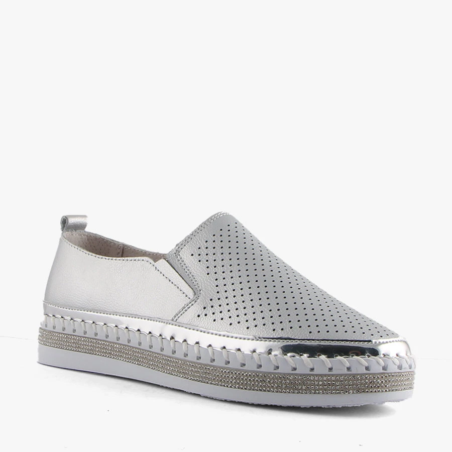 Capry by Just Bee is a women’s flat that features a soft leather upper with perforated front panel, a diamante toe cap and a diamante trim around the sole.