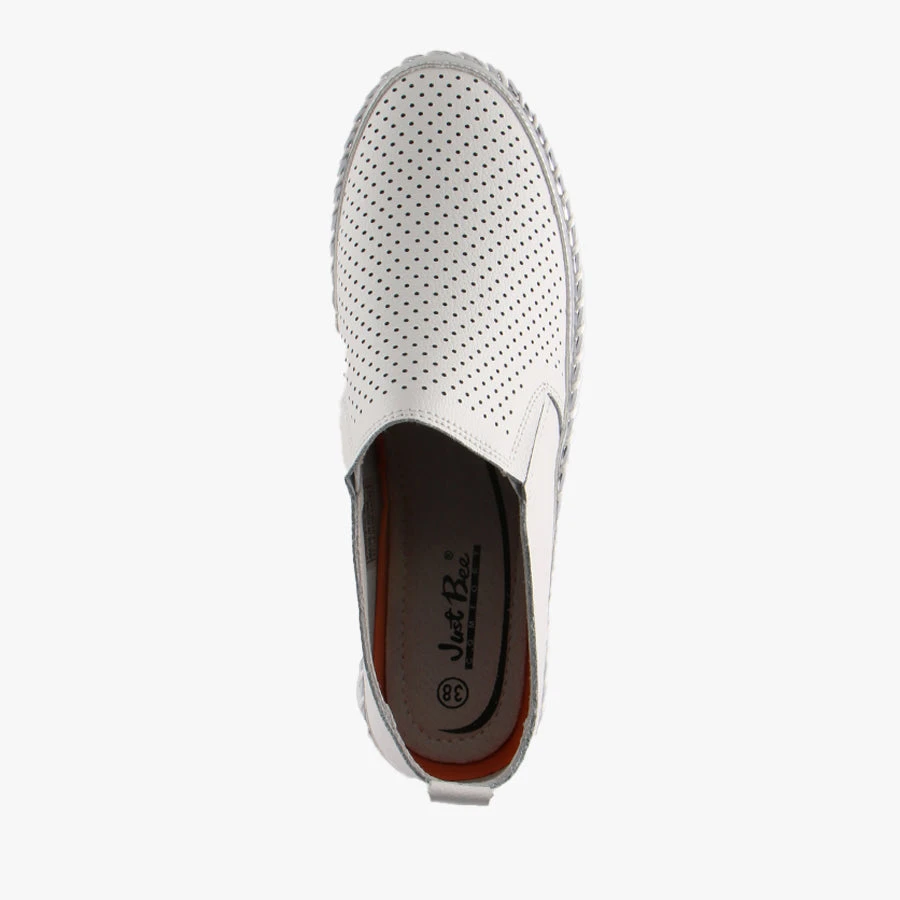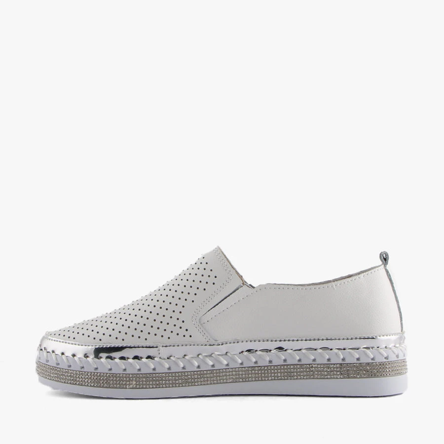 Capry by Just Bee is a women’s flat that features a soft leather upper with perforated front panel, a diamante toe cap and a diamante trim around the sole.