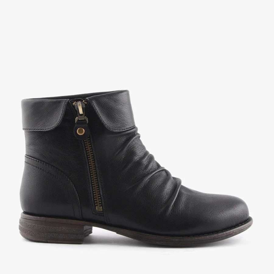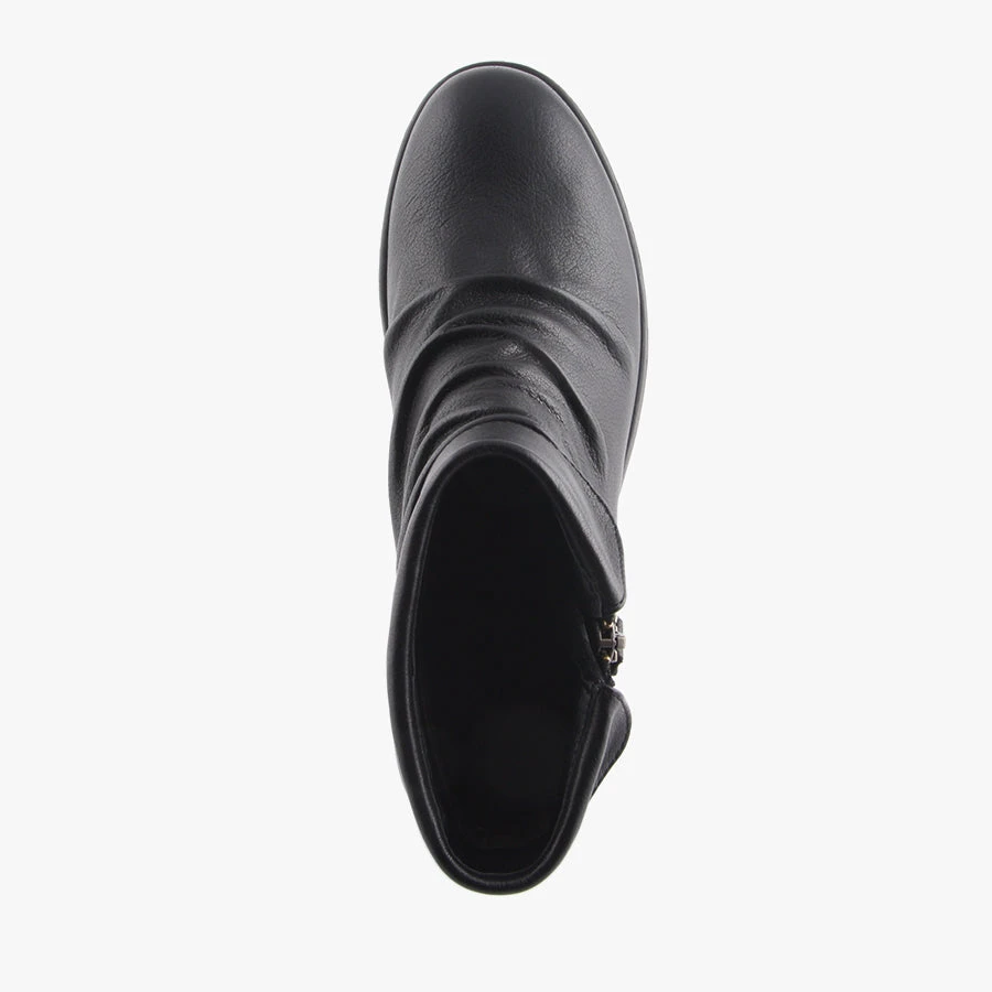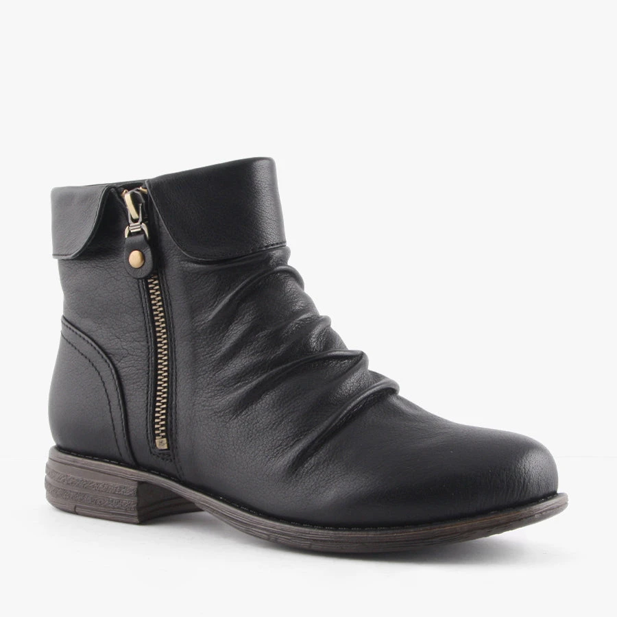 Carlson by Natural Comfort is a smart women’s boot that features a soft leather upper with ruche detailing across the front, functioning side zip and soft microsuede lining.