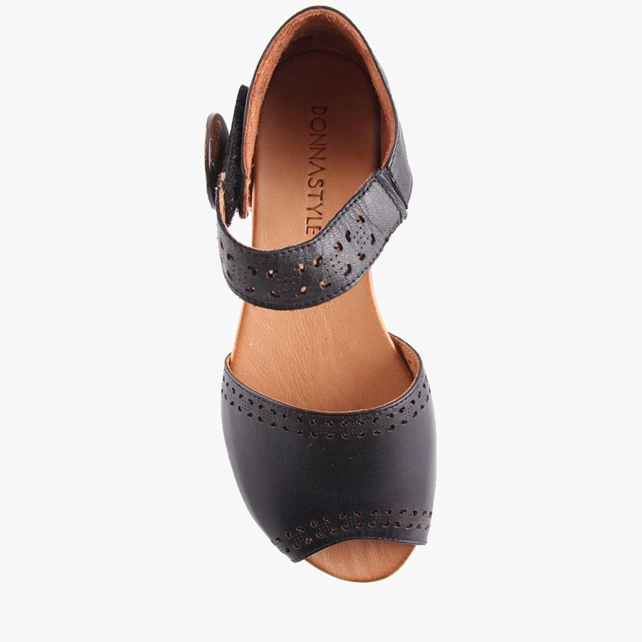 Carter by Donna Style is a classic flat sandal for Summer. It features an soft leather upper with lazer cut detail and Y ankle velcro strap for easy entry, with decrorative button.