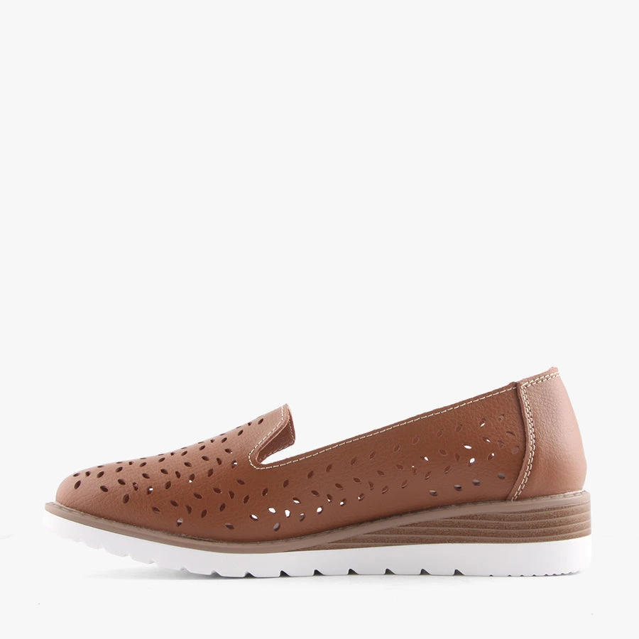 Chevy by Just Bee is a women’s slip on loafer that features a laser cut perforated detail on a soft leather upper and a comfortable low wedge heel.
