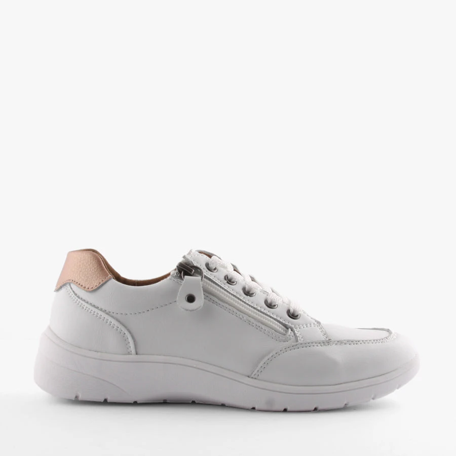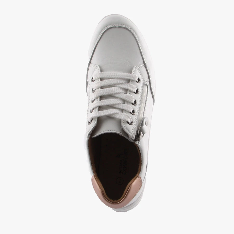 Dulcera by Natural Comfort is a women’s leather sneaker with a front zipper and rose gold panel on the back of the heel.