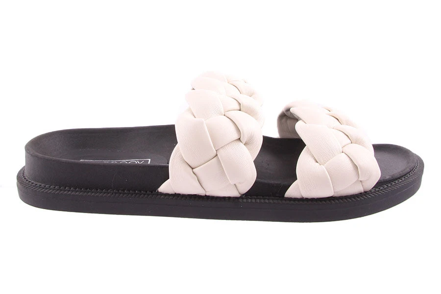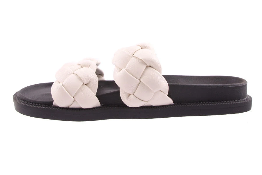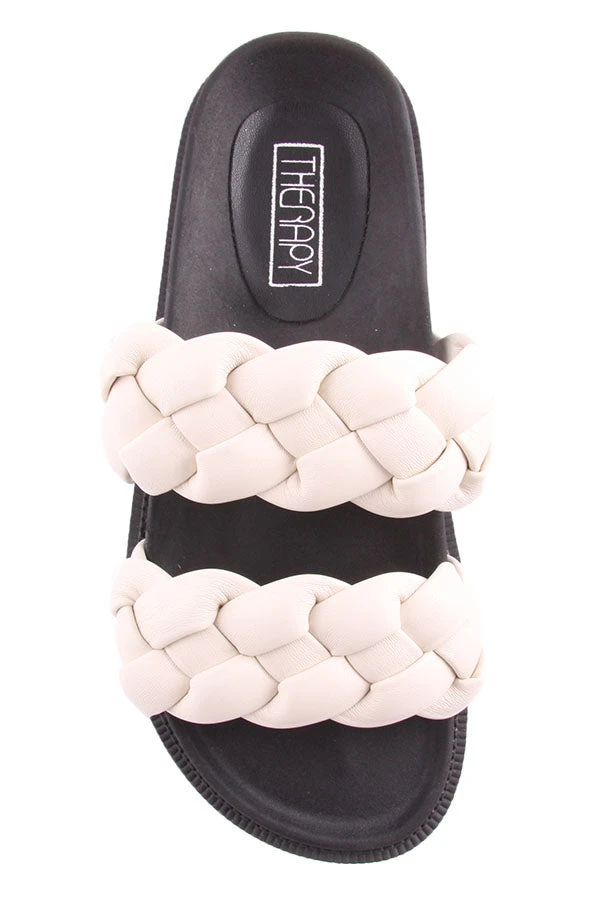 Elle by Therapy is a women’s slide featuring a comfortable contoured foot bed and two straps with a decorative plait detail.