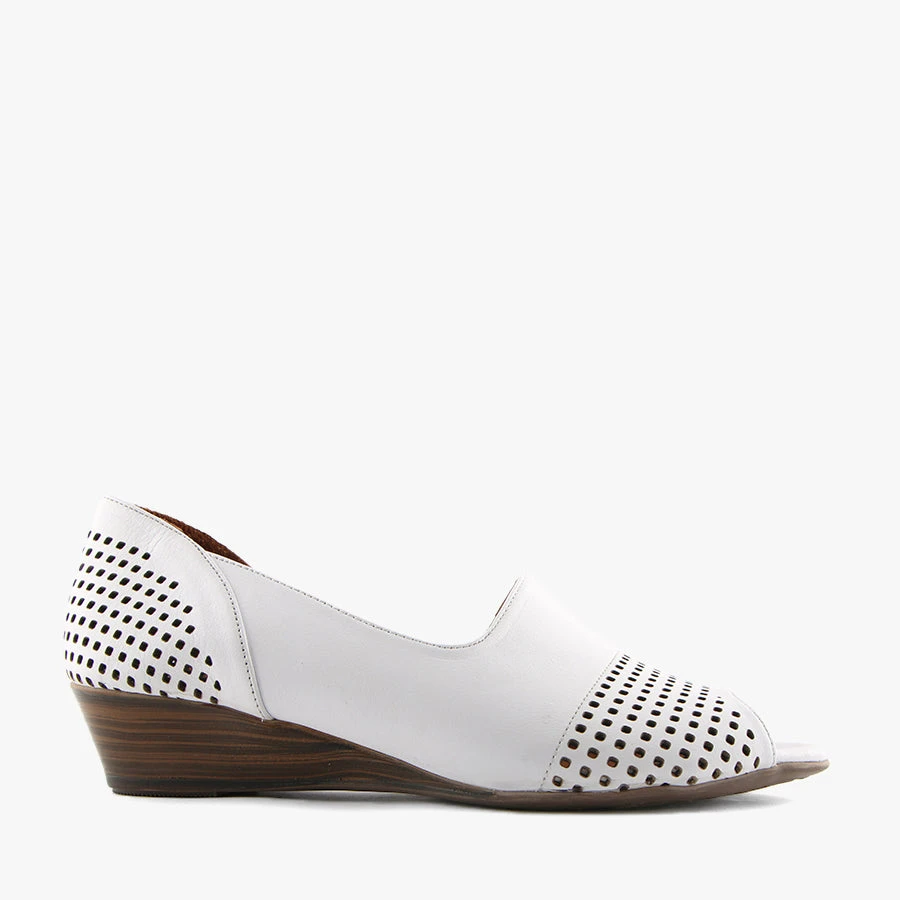 Fawcett by Mago features a comfortable low heel and peep toe design with perforated details on the heel and toe.