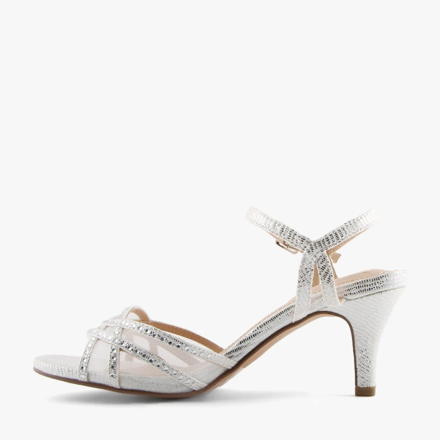 Geico by Clarice is a dress sandal that will dazzle. Geico features a buckled ankle strap and a smart shimmer printed upper with mesh and diamante embellishments.