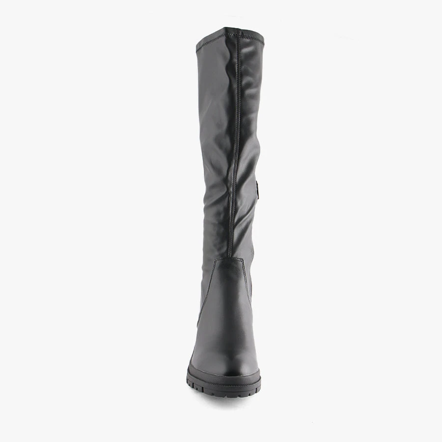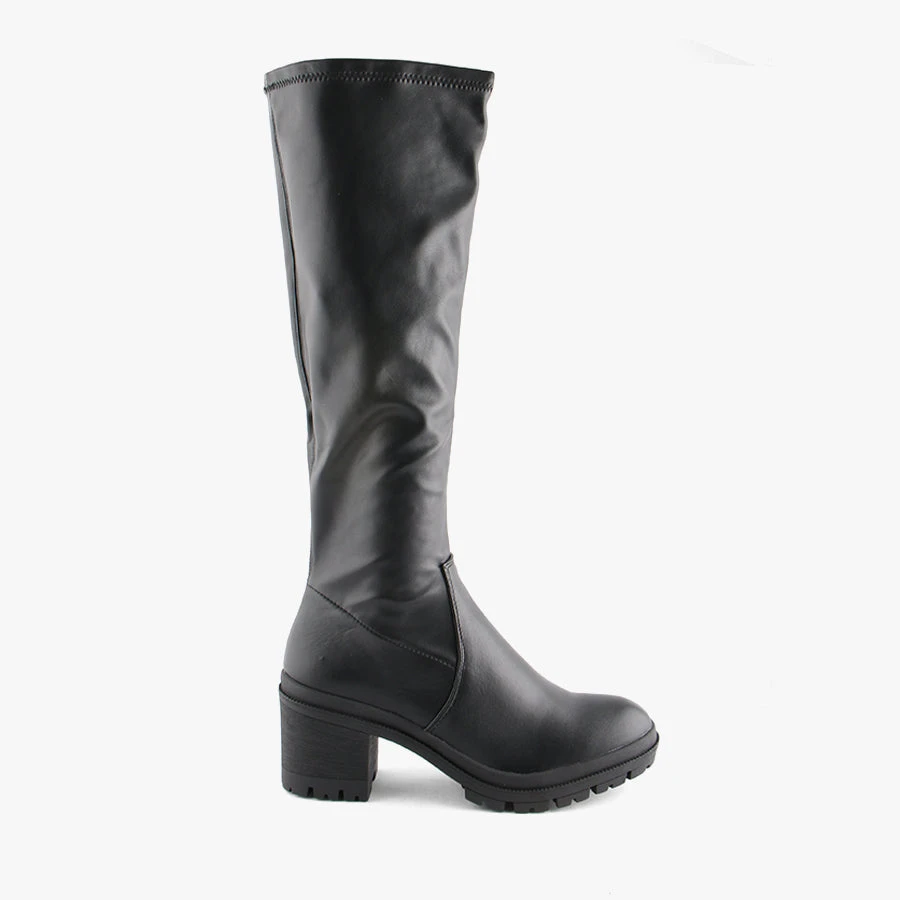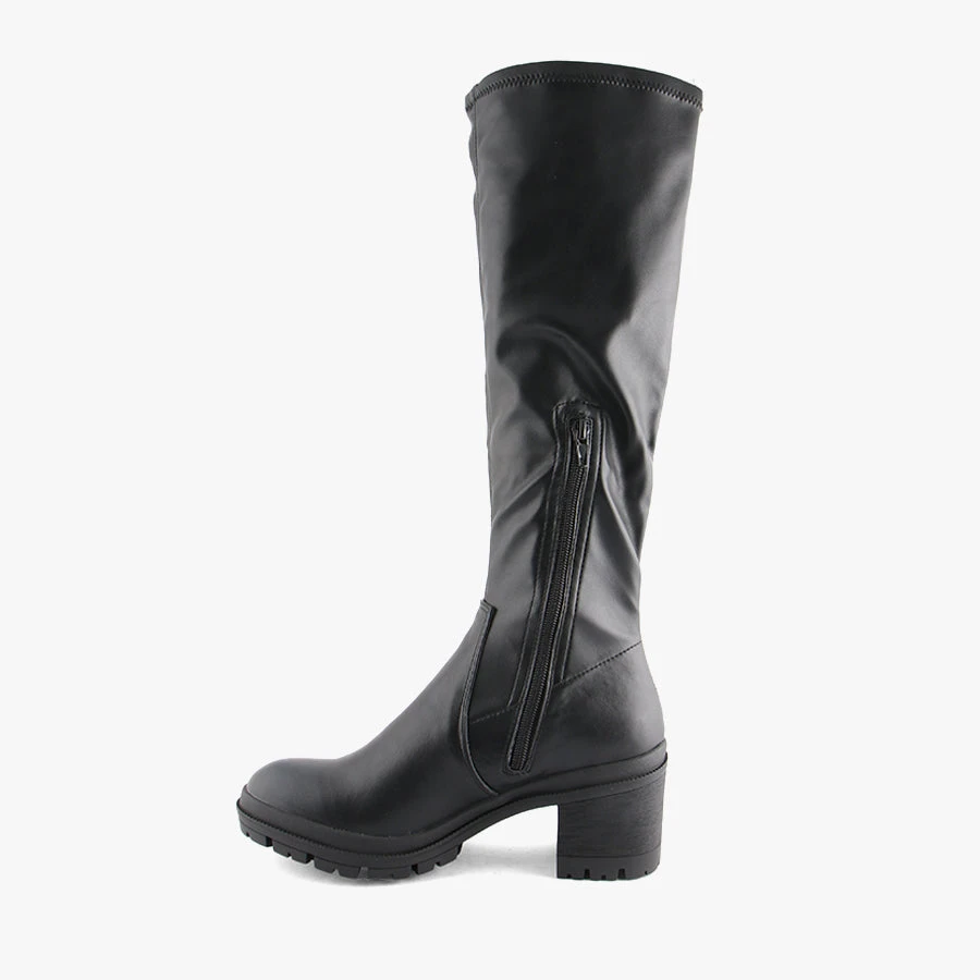 Genna by Verali s a long women’s boot that features a block heel, full length side zip and a stretch fabric upper that will fit comfortably around the leg.