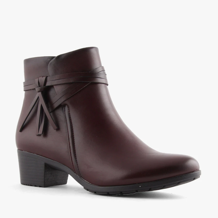 Kaya by Baretraps is a women’s ankle boot with a block heel and rounded toe. Kaya features a smart leather-look upper, and a tassel detail on the side.