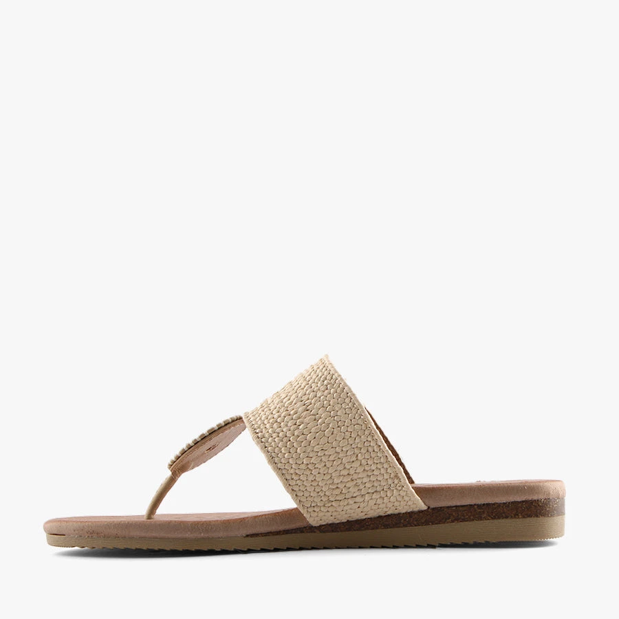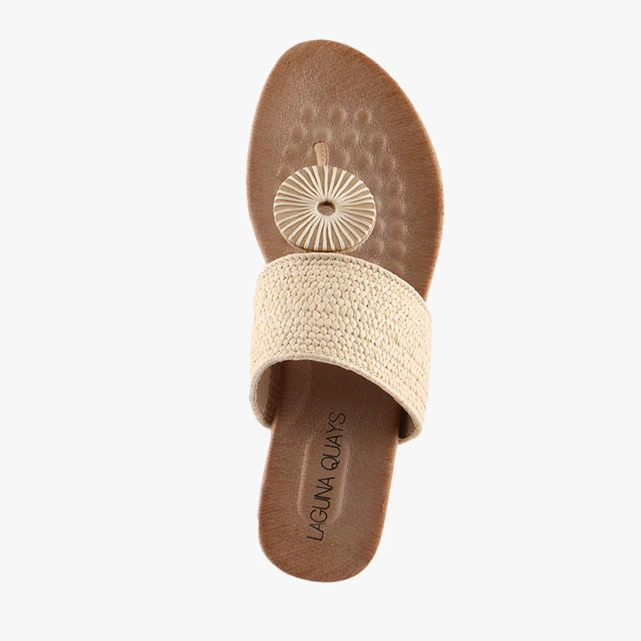 Kendra by Laguna Quays Resort is a women’s versatile thong with a textured sole,woven straps and a cork-latex sole with slim wedge.