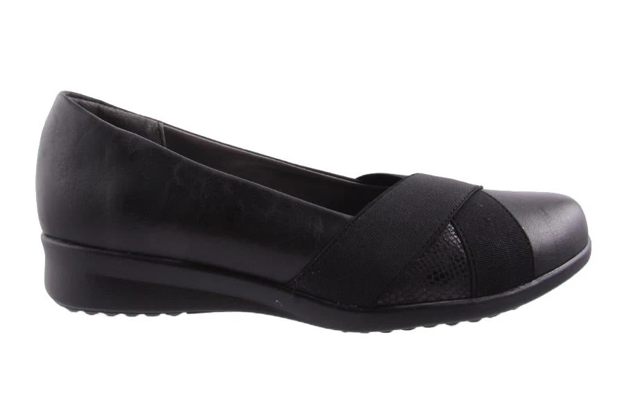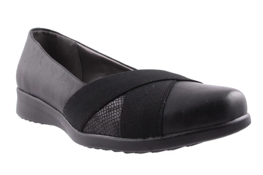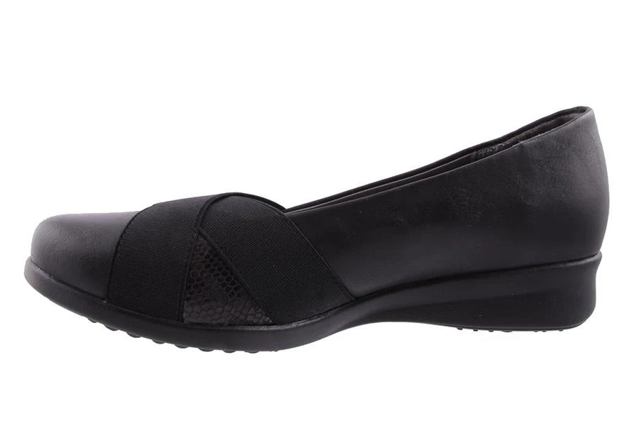 Kimmy by Baretraps is a woman’s comfort wedge featuring a padded insole, croc printed accents and elastic cross straps for all day comfort.