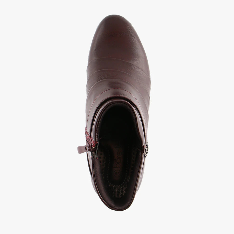 Kipper by Baretraps is a woman’s ankle boot that features a low stacked heel and side zip for easy wear. Kipper’s pleated fabric details and fake strap across the top make this the perfect style to dress up.