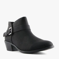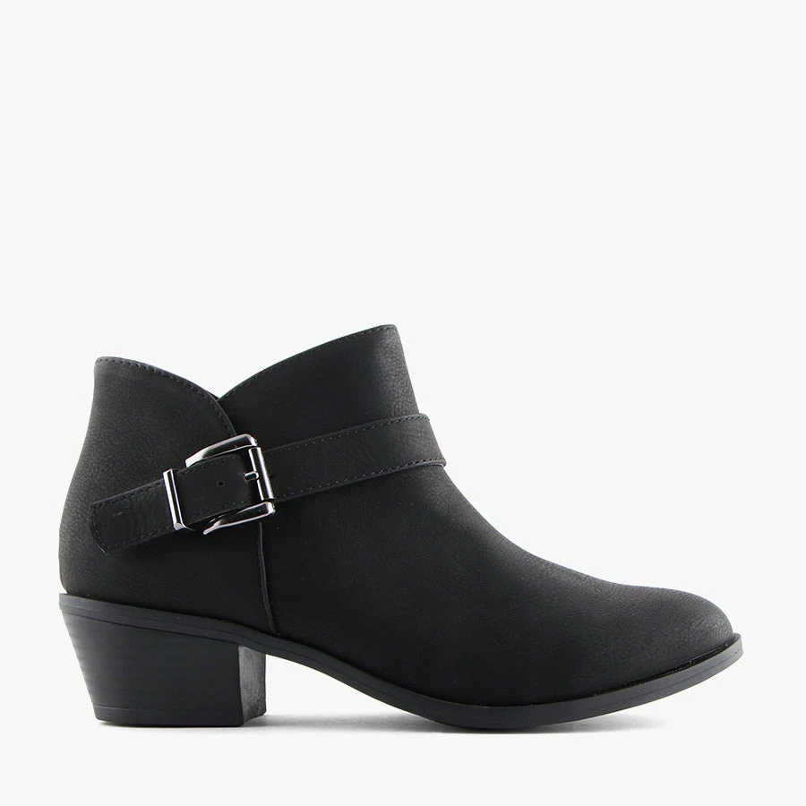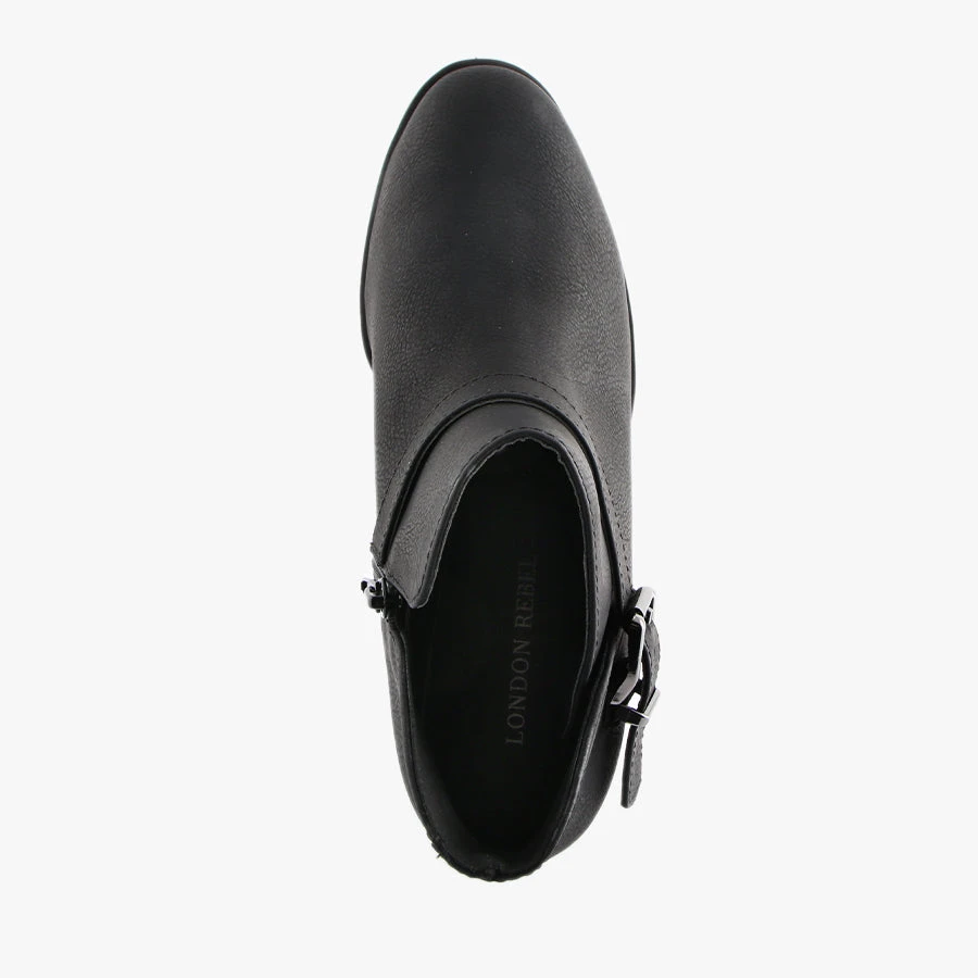 Lombre by London Rebel is a women’s ankle boot embellished with a buckled strap and side zipper on a low heel.