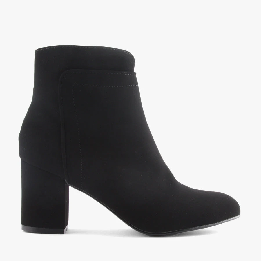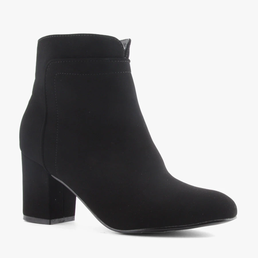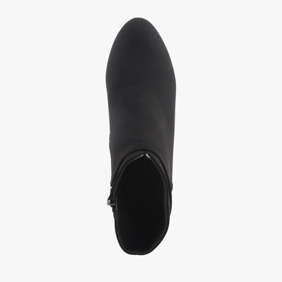 Luisa by Pied A Terre is a women’s ankle boot featuring a microsuede upper detailed with piping trim and a metallic side zipper on a stacked heel.