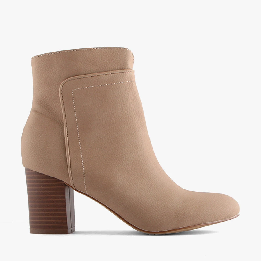 Luisa by Pied A Terre is a women’s ankle boot featuring a nubuck upper detailed with piping trim and a metallic side zipper on a stacked heel.