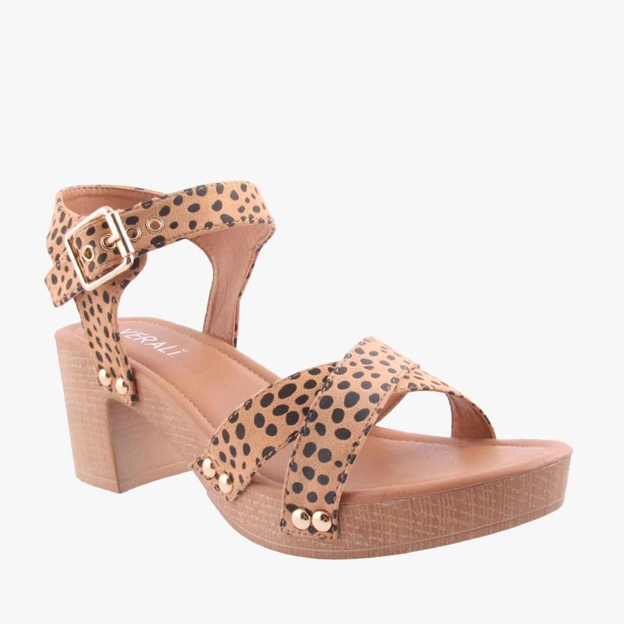 Complete your look with Lulu by Verali. This women’s heeled sandal features a cross over design with gold studs on the lightweight sole.