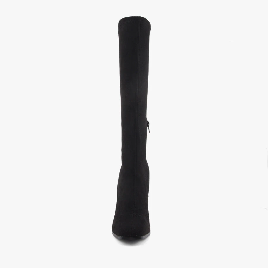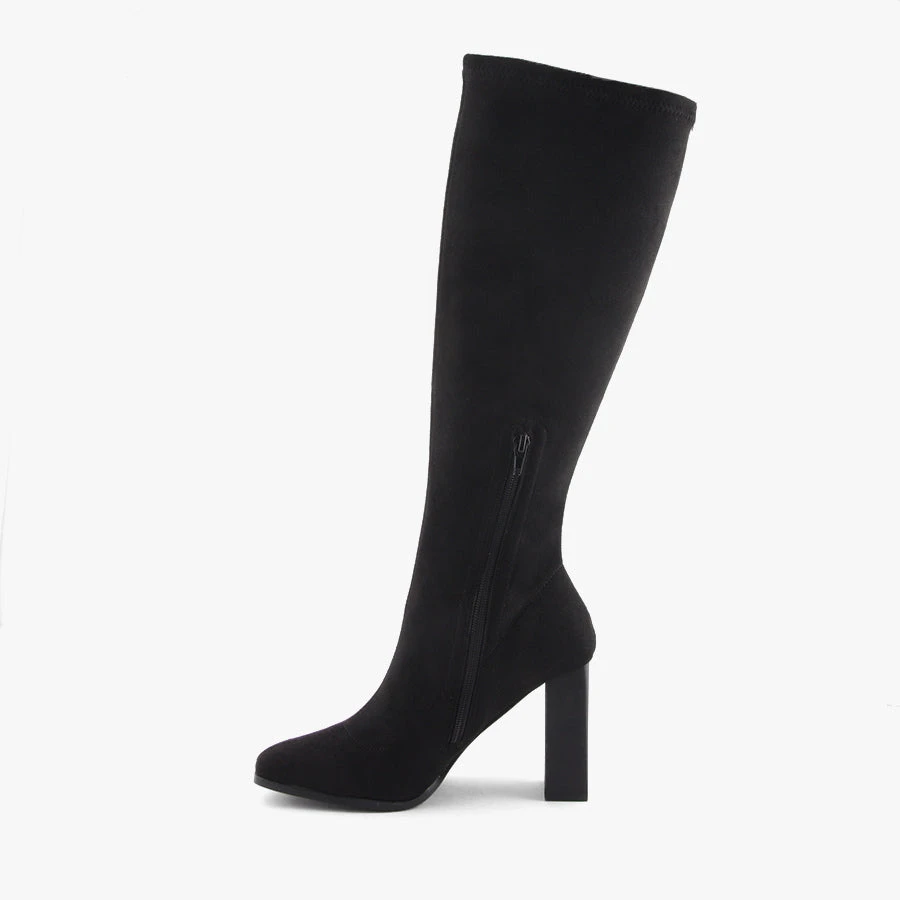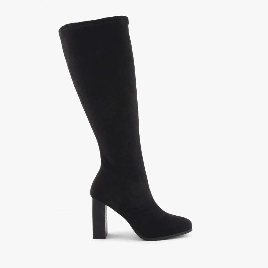 Macey by Verali is a long women’s boot that features a stacked block heel, an on trend square toe, side zip and a stretch fabric upper that will fit comfortably around the leg.