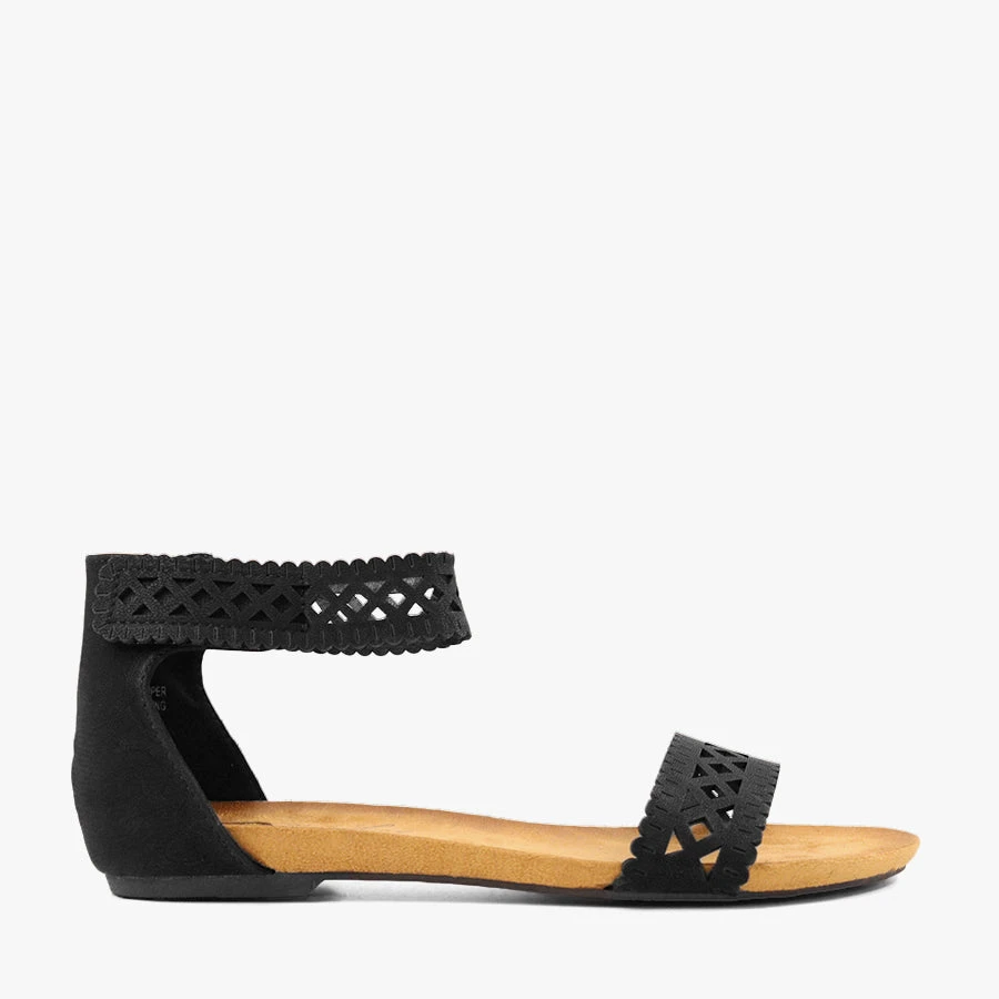 Marcia by London Rebel is a women’s flat sandal featuring a laser cut design across the toes and around the ankle, closing with a velcro strap and finished with a soft microsuede lined insole.