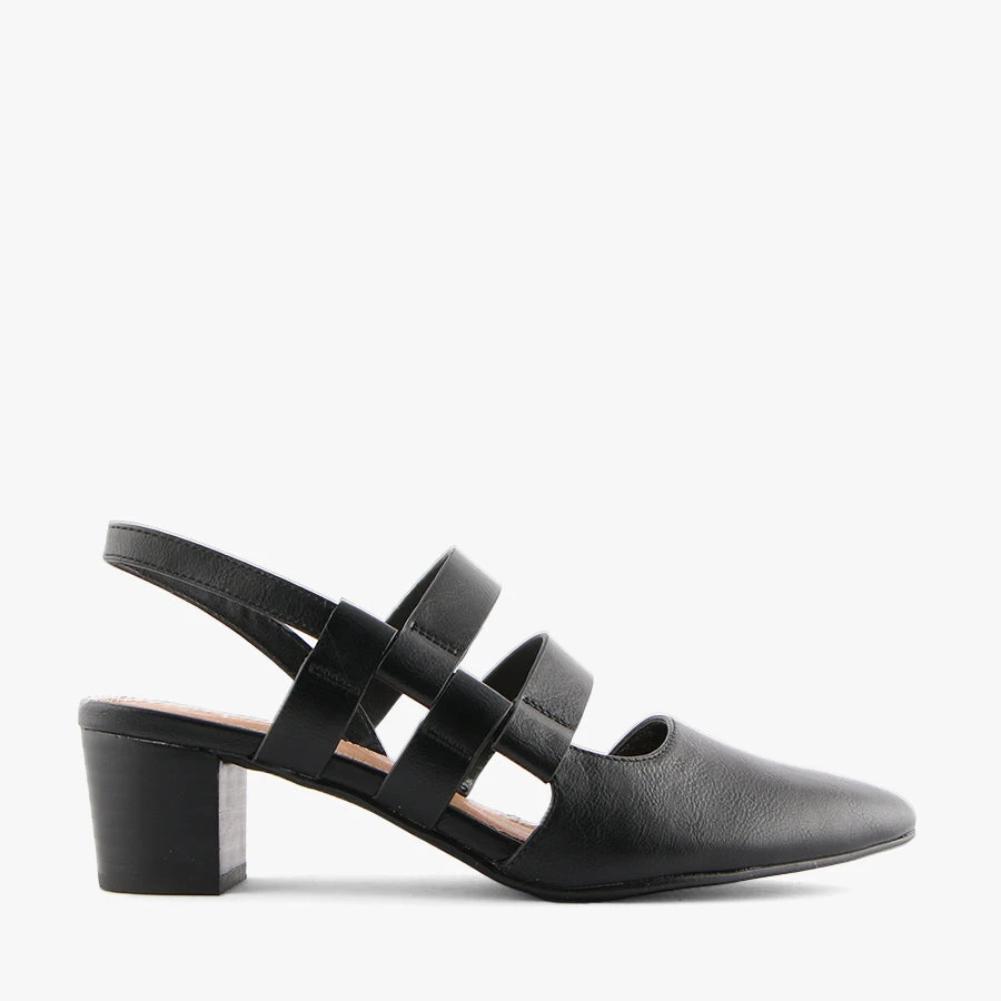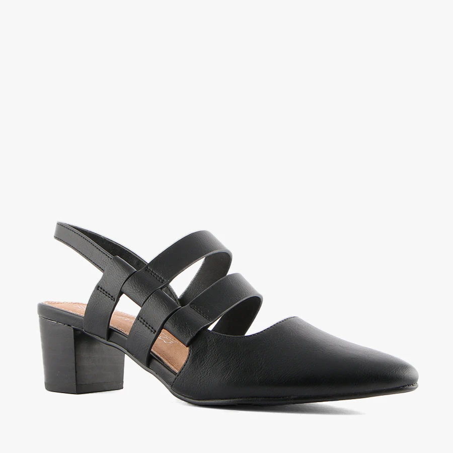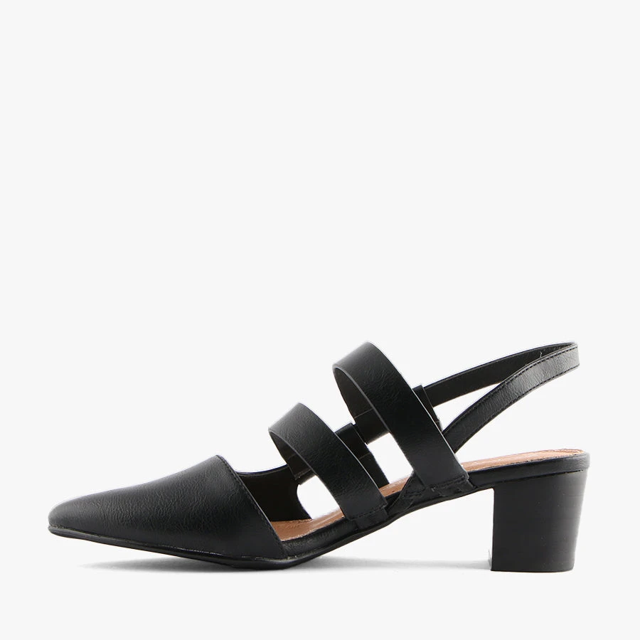 Mercer by Bay Lane is a stunning sling back heeled sandal featuring a pointed toe with a multi strap design which is elasticated for ease of removal.