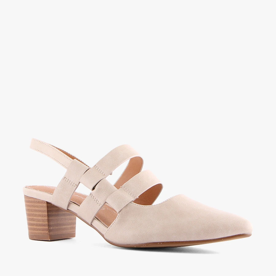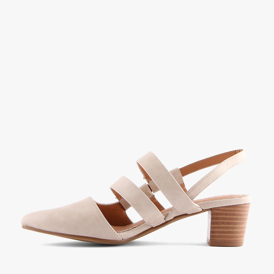 Mercer by Bay Lane is a stunning sling back heeled sandal featuring a pointed toe with a multi strap design which is elasticated for ease of removal.