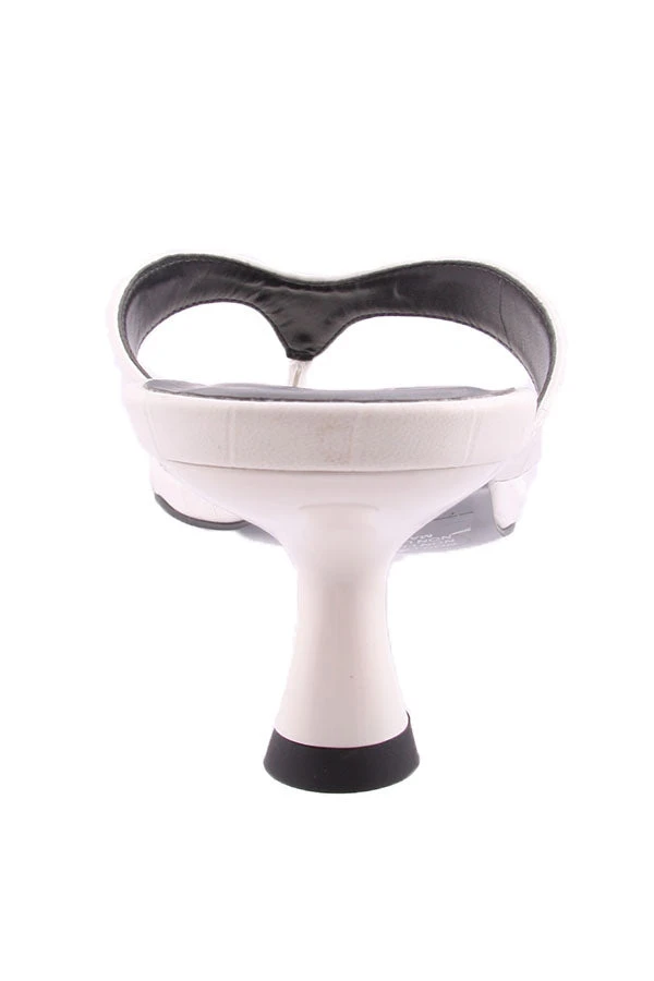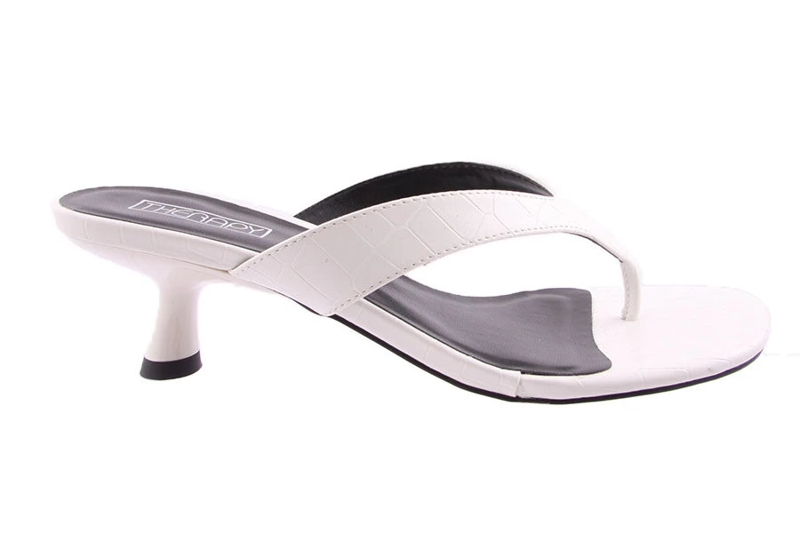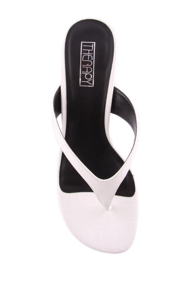 Mici by Therapy is a woman’s thong featuring a low heel and croc print upper.