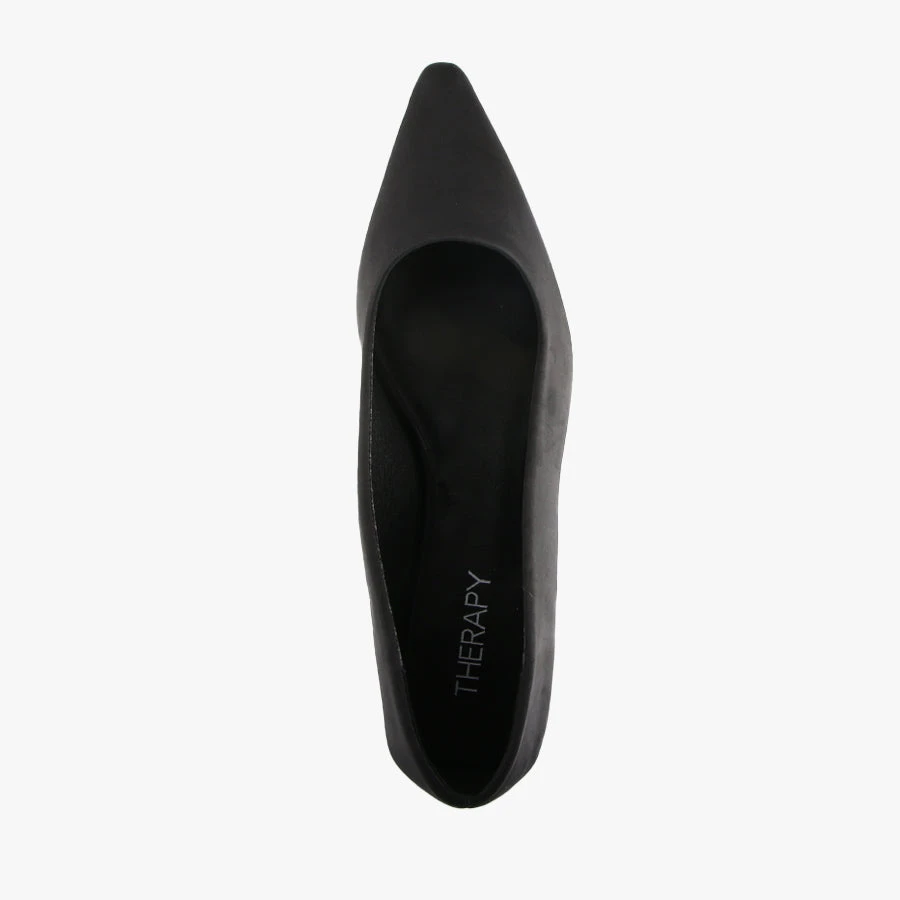 Mirage by Therapy is a women’s flat that features a smooth satin upper, pointed toe and smart low heel.