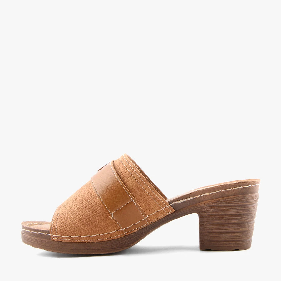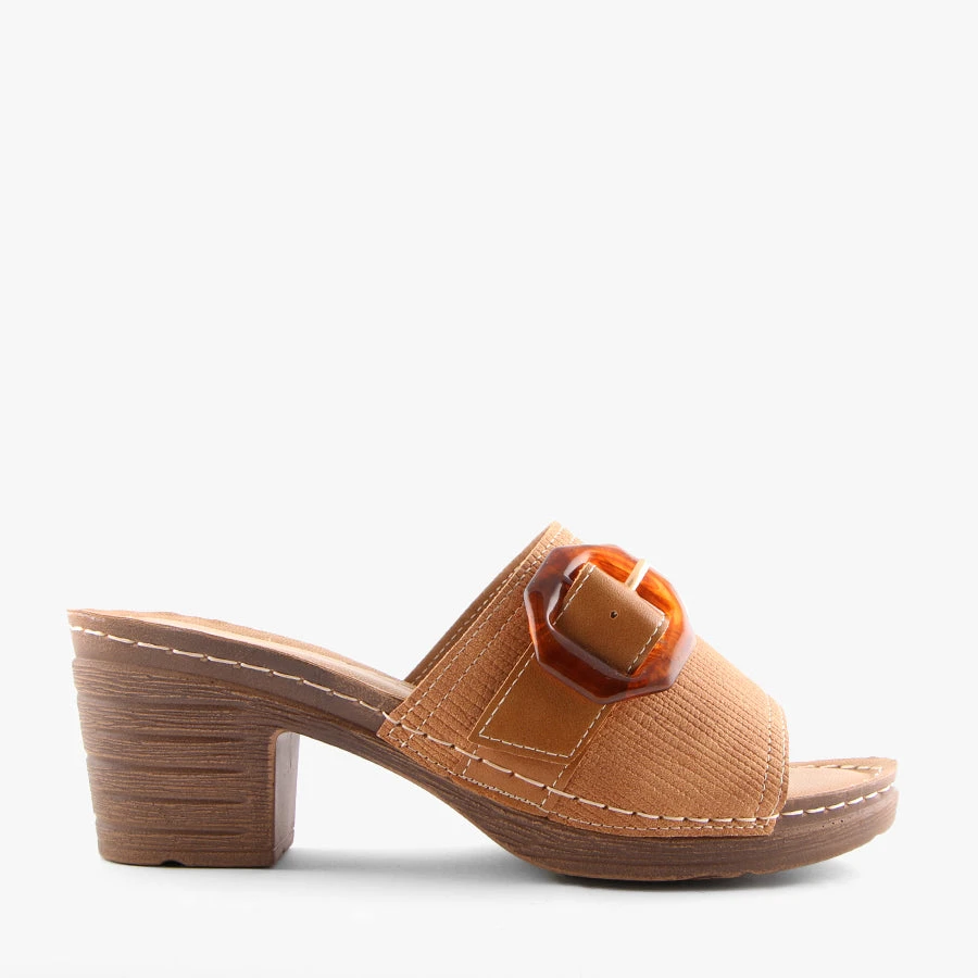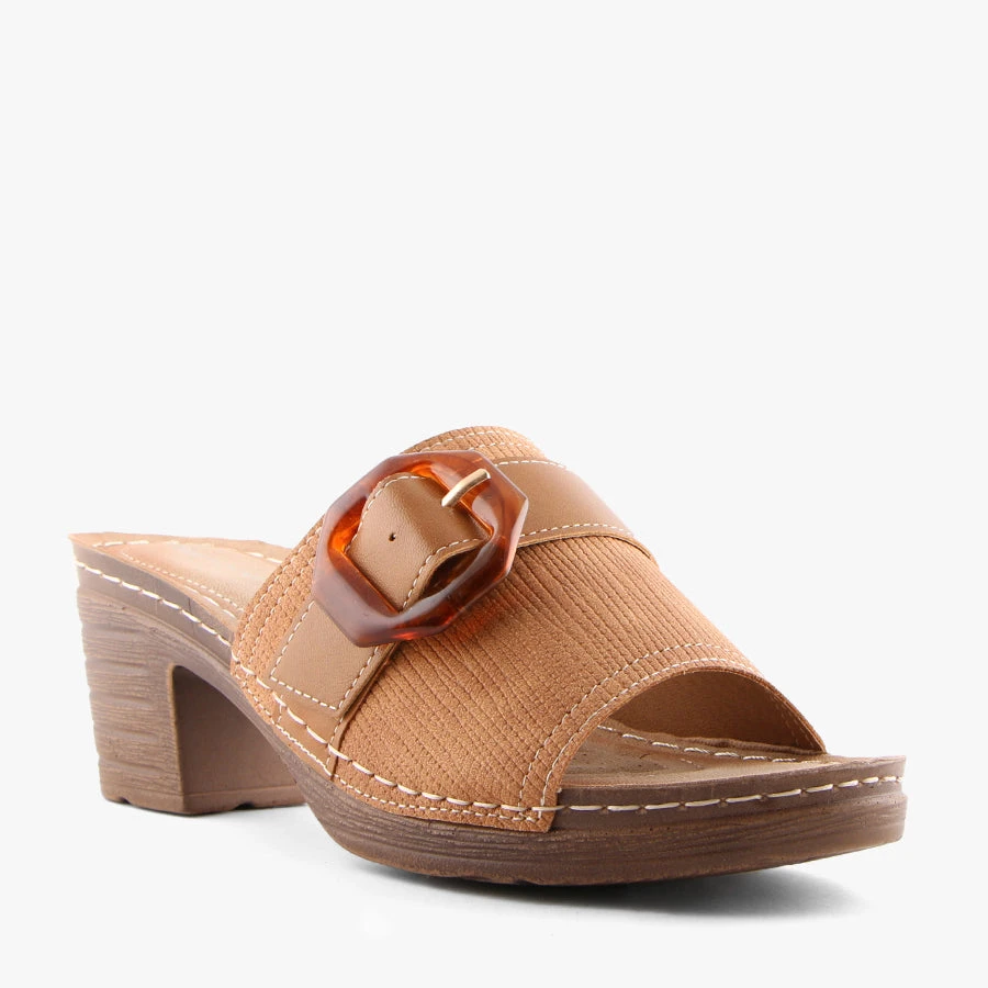 Mozy by Simona Ricci is a backless block heel that features an ultra lightweight sole, a padded insole, and a single wide strap with decorative buckle.