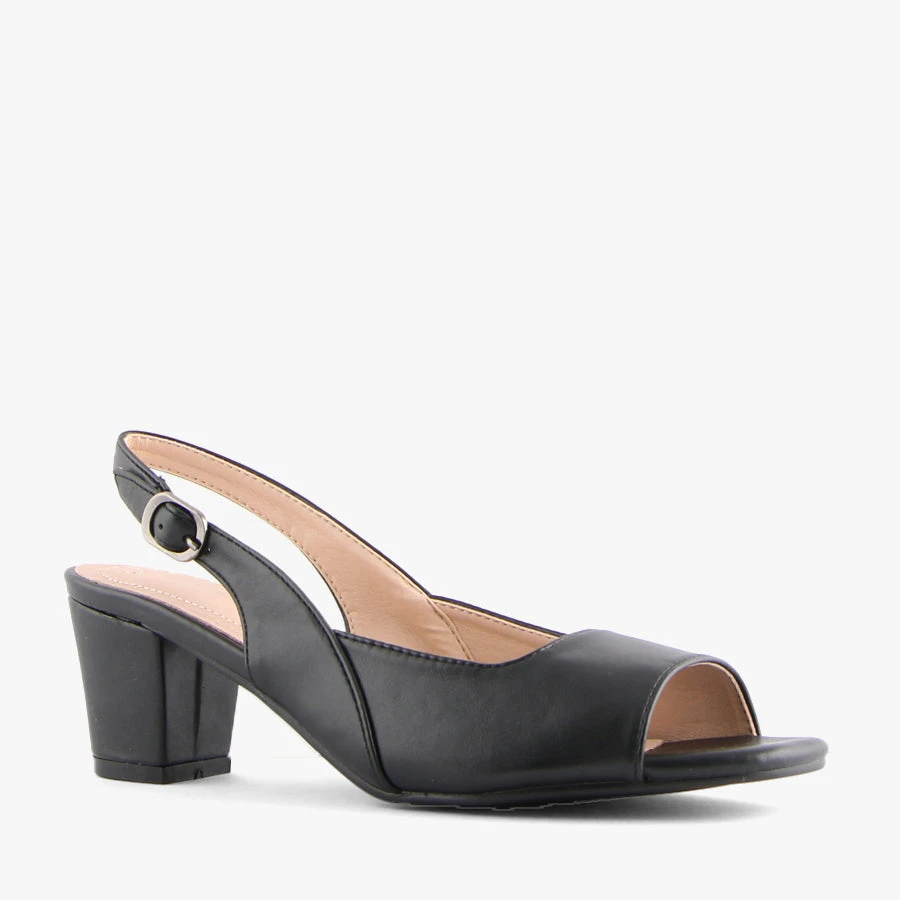 Nan by Clarice is a women’s sling back dress shoe with a tapered block heel. Features an open toe and square-cut detailing