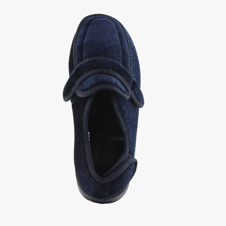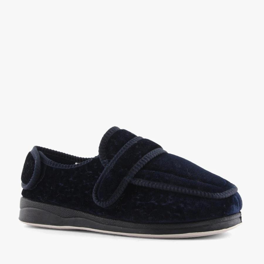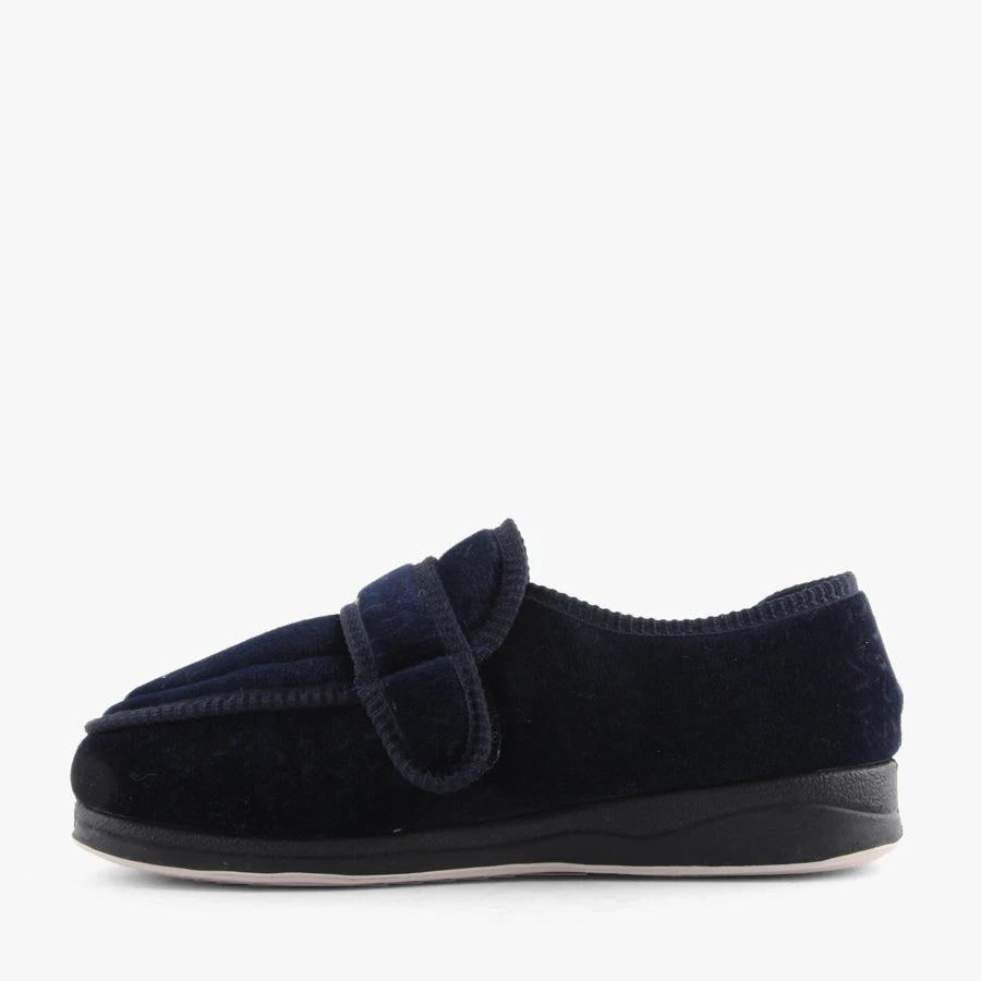Elisa by Panda is a women’s velvet slipper featuring adjustable velcro straps across the front of the slipper and at the heel finished with a flexible sole.