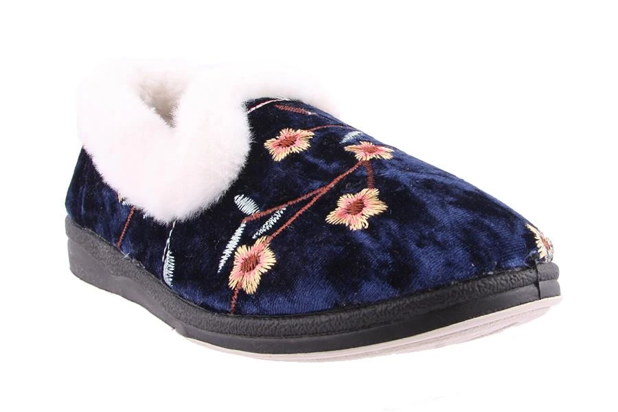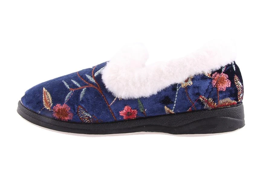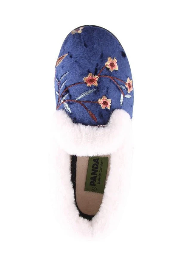Emille by Panda is a women’s slipper with a velour upper and embroidered details, a soft faux fur lining and cushion. All Panda slipper feature a non-marking rubber outsole.