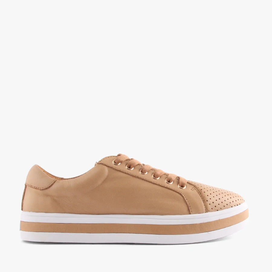 Paradise by Alfie And Evie is a simple womens lace up sneaker featuring a perforated centre panel, platform sole and gold eyelets