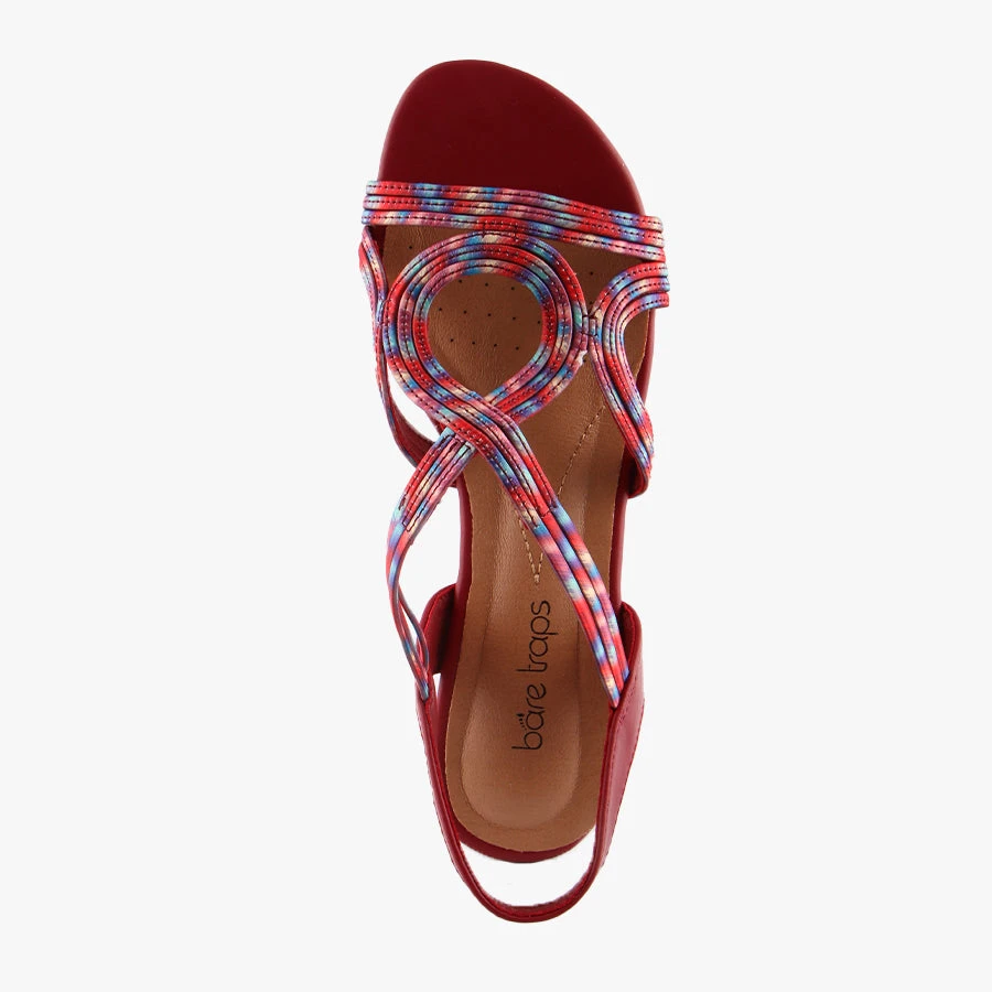 Randi by Baretraps is a women’s sandal featuring a strappy upper with elastic sides straps on a low wedge.