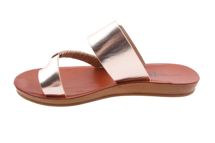 Slide into Riviera by London Rebel. This casual women�s sandal features a metallic gold upper, a buckled strap and wrap over embellishment.