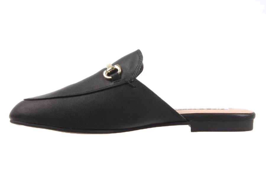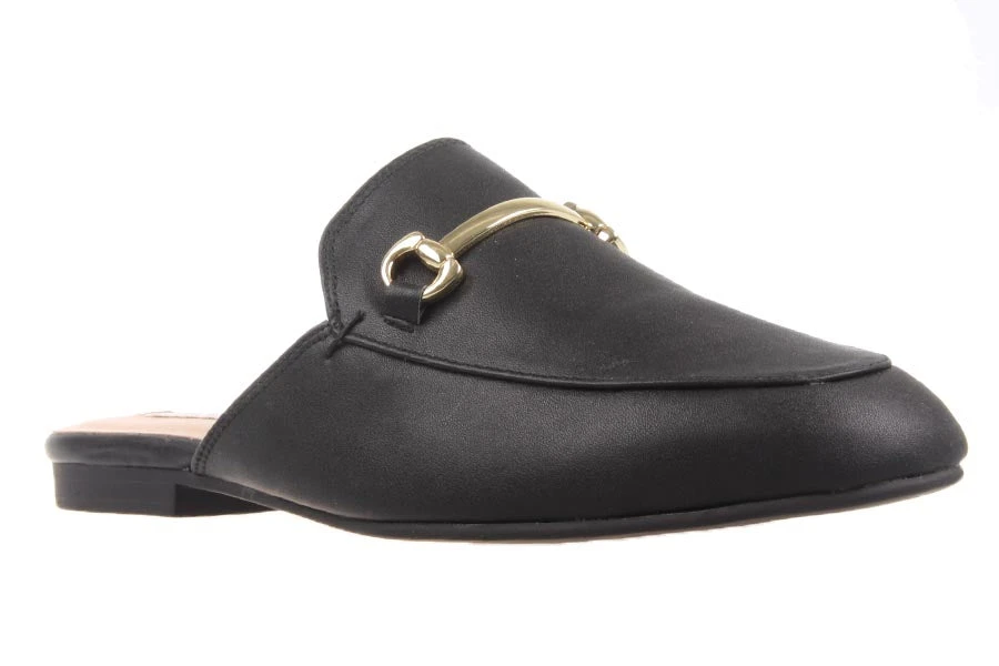 Slide into Shinzu by Pied A Terre. This women’s mule features gold buckle trim on the upper with a rounded toe.