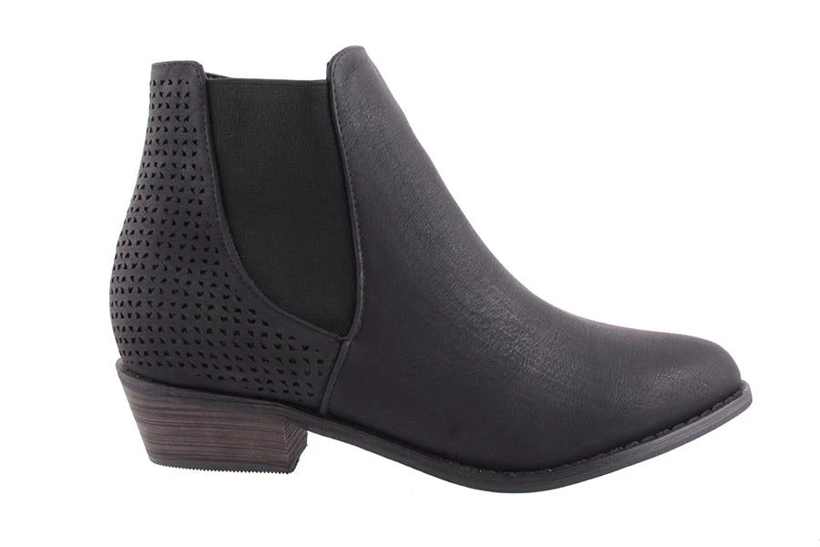 Sideling by Step On Air is a woman’s ankle boot that features an elastic gusset with inside zip, low stacked heel and laser cut design on the heel.