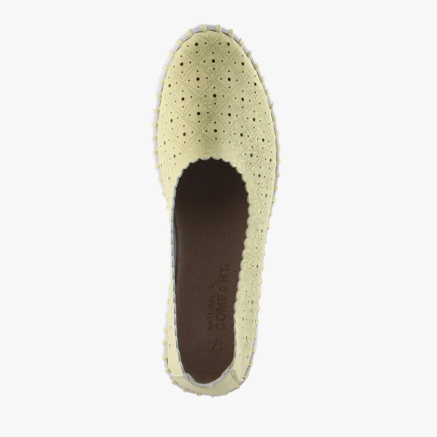 Tai by Natural Comfort is a women’s flat that features a laser cut perforated design and a scalloped cut around the top with a flexible outsole.