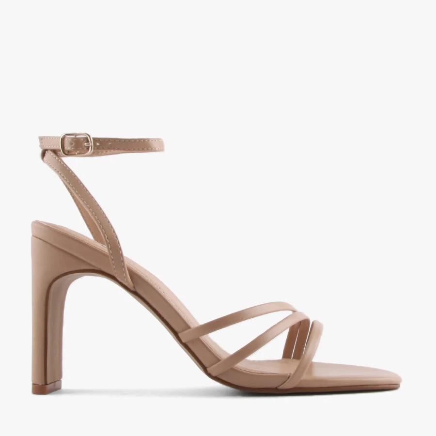 Tia by Naughty Monkey is a women’s ankle strap heel featuring a refined but sturdy slim block heel with an adjustable ankle strap and three thin straps sit across the toe and foot.