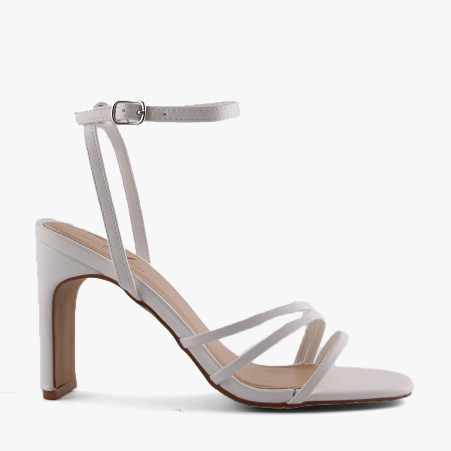 Tia by Naughty Monkey is a women’s ankle strap heel featuring a refined but sturdy slim block heel with an adjustable ankle strap and three thin straps sit across the toe and foot.