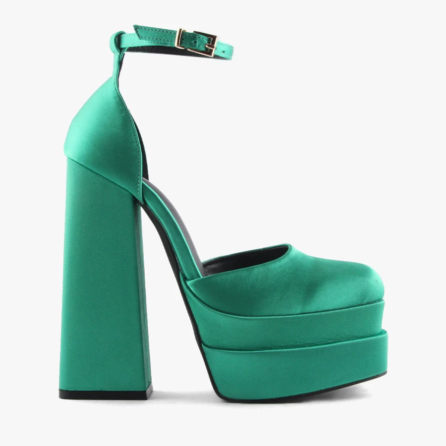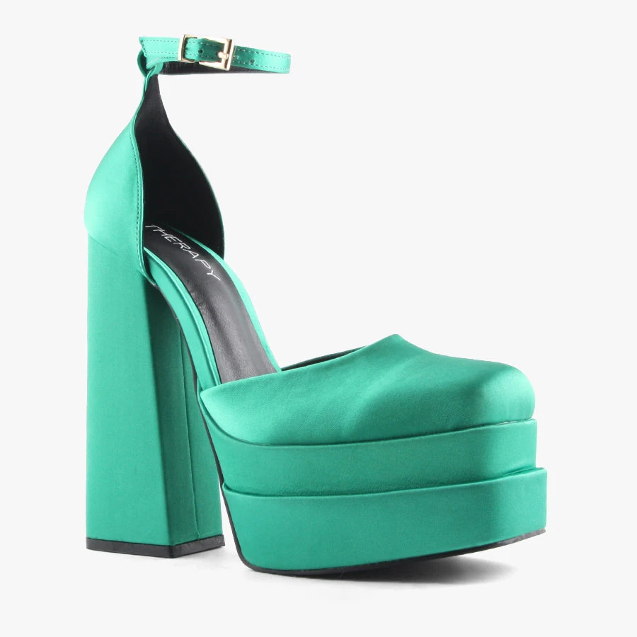 Make a statement in Viva by Therapy. This fun pump has a smooth satin upper, flared block heel and a square closed toe on a bold double platform.