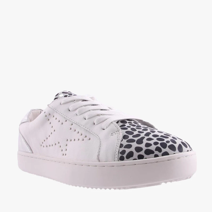 Vovo by Alfie And Evie is a women’s edgy lace up sneaker featuring a star stud trim, gold metallic heel and animal print front insert.