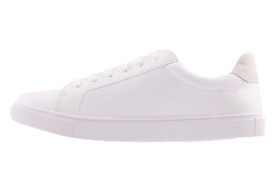 Step into Whisper by Verali. This lace up sneaker features a croc textured upper and simple heel trim.
