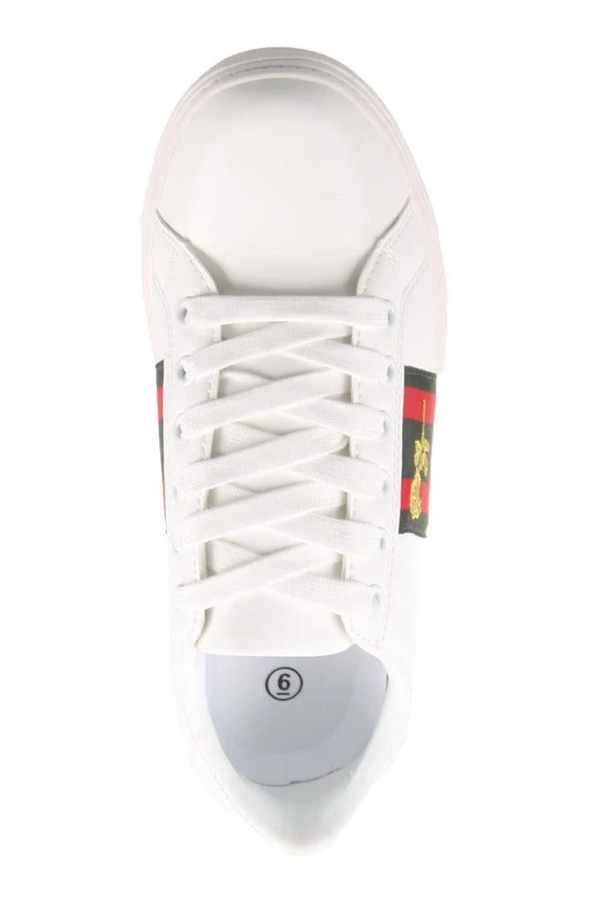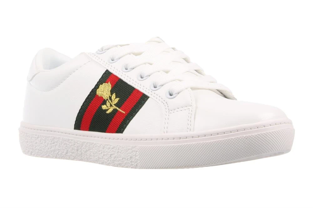Wiley by Naughty Monkey is a women’s white sneaker embellished with green and red ribbon finished with an embroidered rose. Great for mixing and matching with your casual wear.